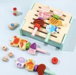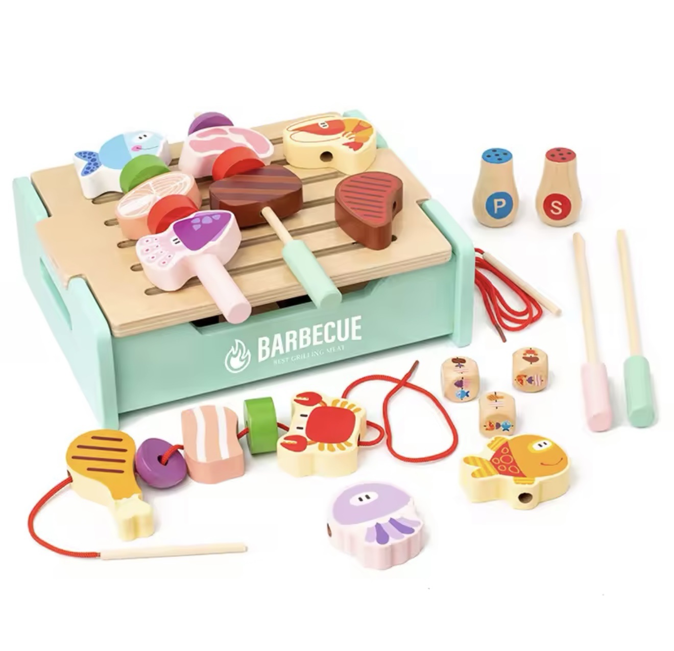 طقم الشواء الخشبي مصنوع من خشب آمن وعالي الجودة، يحتوي على أسياخ، خضروات، ولحوم ملوّنة تضيف جوًا ممتعًا للعب