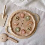 الطقم يحتوي على قاعدة بيتزا خشبية، شرائح ملونة، وإكسسوارات مثل سكين تقطيع وصحن 🌱.